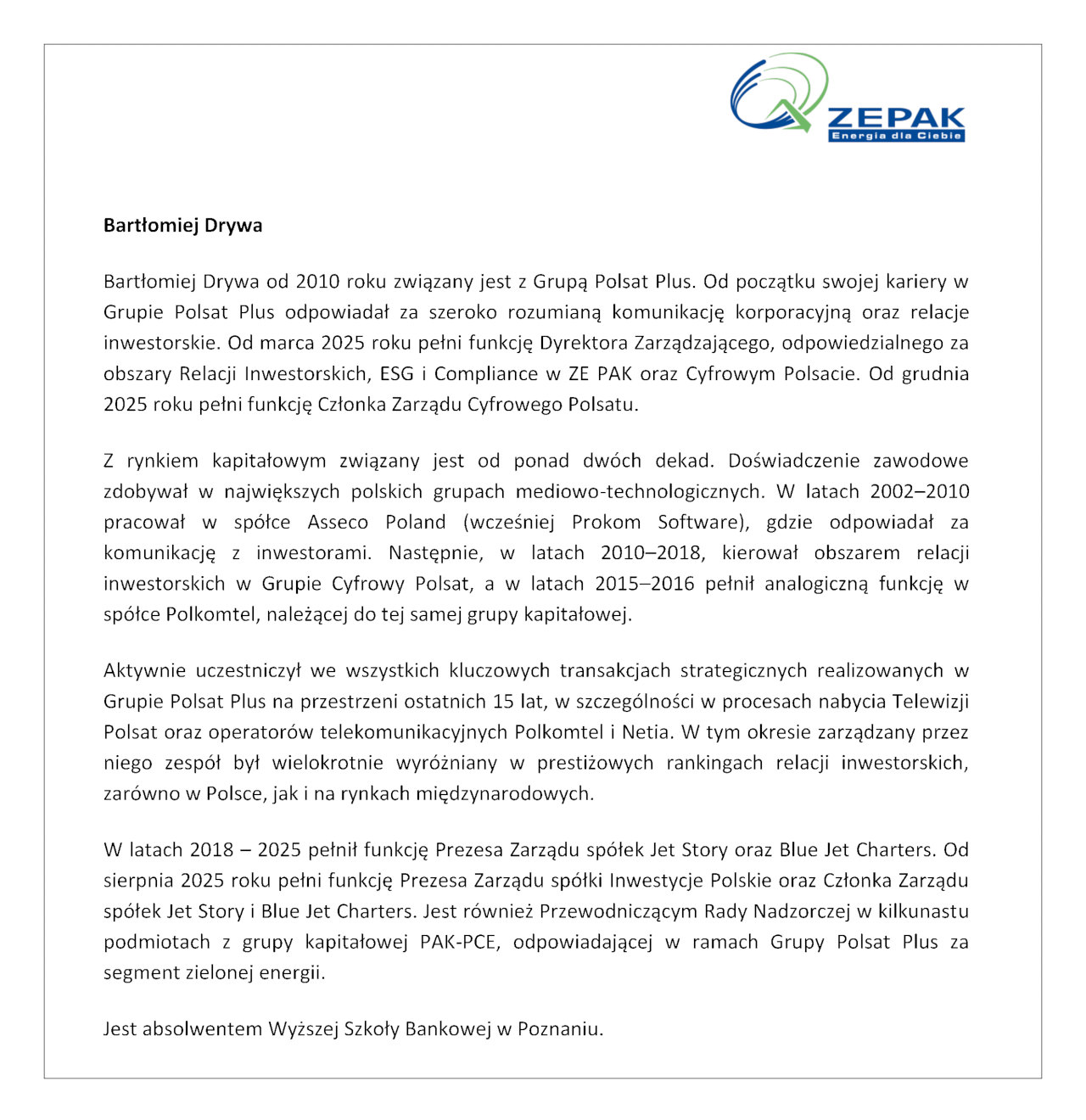Strona główna O firmie Władze spółki Zarząd - opis Bartłomiej Drywa